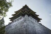 A majestic ancient temple in Beijing, China. The ornately carved roofing and decorative designs showcase classic Chinese architecture. The clear sky adds to the splendor of this historic site.