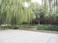 This is an image taken in Beijing, China, showcasing the beautiful urban flora and green spaces of the city. The clear sky provides the perfect backdrop for the lush grass, trees, and shrubs found throughout the city. The image features a picturesque walkway surrounded by a grove of willow trees. The open spaces, parks, and courtyards in Beijing provide a serene atmosphere for residents and visitors alike. This photo captures the essence of the city's natural beauty and the harmonious coexistence of nature and urban life in Beijing.
