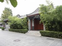 This image showcases a classic Chinese building in Beijing, China. The walkway is lined with shrubbery, leading to the entrance adorned with traditional door and window windows. The clear sky above highlights the beauty of the surrounding architecture. The residential area features well-maintained driveways and courtyards, with trees adding a touch of nature to the urban landscape. The concrete road surface provides easy access to the different properties in the neighborhood. This photo perfectly captures the charm and elegance of Chinese architecture in a vibrant urban setting.