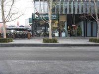 This is an image of a busy city street in Beijing, China. The view shows a road lined with buildings and mixed-use developments in the Sanlitun neighborhood. The road surface is made of asphalt and there are lanes for automobiles. The urban landscape is filled with vegetation, including trees. It is daytime and the sky is filled with clouds. This photo captures the vibrant and bustling atmosphere of downtown Beijing, specifically in the Sanlitun area, known for its shops, restaurants, and entertainment venues.