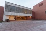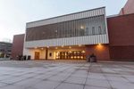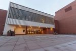 A fisheye lens captures the unique architecture of a circular building with a clock tower in Bellingham, Washington, USA. The building stands out in the urban landscape, surrounded by other buildings and open spaces.