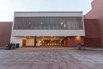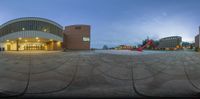 a photo taken of a view from a fisheye lens of a large, circular building with a clock tower