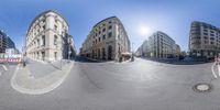 the camera is distorted into three different buildings on a city street in this 360 - shot