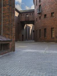 brick buildings are in an empty courtyard area near a bench and building with brick walls