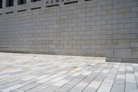 A modern urban design in Berlin, Germany. A small brick patio sits adjacent to a museum with a grey surface and a rectangle of wood flooring. The open door reveals a glimpse of city life.