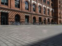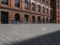 This is an image of a classic architecture building in the city of Berlin, Germany. The brick wall and industrial aesthetic reflect the urban design of the area. The hard shadows cast on the courtyard create a dramatic effect. This photo captures the mix of historical and modern elements in Berlin's architecture. It could represent a business district or financial hub. The image showcases the beauty of European urban landscapes and the industrial history of Berlin. With its unique blend of architectural styles, this photo is ideal for projects related to urban design or business.