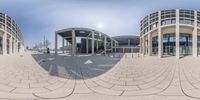 A modern architectural marvel in Berlin, Germany. The building's courtyard reflects in a spherical 360-pane lens, capturing the essence of urban design. The clear sky adds to the charm of this European business district.