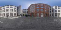 this is a view of a very small street with no cars on it, and the buildings are in perspective as if from the point of fisheye