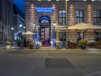 This is an image of a cityscape in Berlin, Germany at night. The photo showcases the captivating architecture and urban design of the city. The mixture of office buildings, cafes, and restaurants create a lively and vibrant atmosphere. The neon lights and street lights illuminate the streets and add to the charm of the city. This image captures the essence of city life in Berlin, where people can enjoy dining out and experiencing the European nightlife. The classic architecture and dark surroundings give a unique character to this metropolitan area.