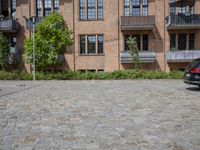 This stock photo showcases the classic architecture of Berlin, Germany. The city's cobblestone roads and asphalt walkways stand in harmony with the residential apartment buildings and houses, creating a picturesque neighborhood. The property's facade features beautiful brick walls and flooring, complemented by open spaces and a clear sky. The suburban and urban atmosphere is portrayed by the road surface and automobile on the driveway. Embrace the charm of Europe with this stunning image.