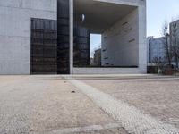 A modern office building in Berlin, Germany. The sleek concrete facade contrasts with the clear sky. The urban open space features a tree-lined road surface, while the sun casts shadows on the building's walls.