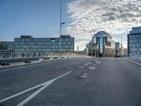 A breathtaking view of Berlin's modern architecture at dawn. The city wakes up to a clear sky, with its business and financial districts bustling with city life. The streets are lined with office buildings, street lights, and wide thoroughfares.