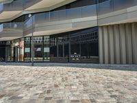 This stock photo showcases modern architecture in Berlin, Germany. The image features a sidewalk with glass on the sides and an empty walkway underneath it. There are several buildings nearby, creating a vibrant residential and business district. The clear sky emphasizes the beauty of the architecture. The cobblestone surface and tile flooring add to the charm of the open space. This image is perfect for illustrating urban development, real estate, and the bustling business atmosphere in Europe's capital city.