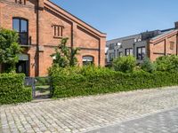 This stock photo showcases the charm of urban design in Berlin, Germany. The image features a picturesque road lined with hedges and stone tiles, leading to a row of elegant townhouses. With a clear blue sky as the backdrop, the classic architecture of the buildings harmonizes perfectly with the surrounding vegetation. This residential area is a testament to the impeccable urban planning and architectural prowess that Berlin is renowned for. Whether you're capturing the beauty of historic cobblestone streets or exploring the warehouse district, this image is an excellent representation of city life in Europe's dynamic capital.