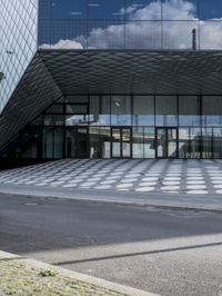 A modern architecture marvel in Berlin, Germany. The futuristic facade of the building is made of glass and metal, reflecting the clear sky and clouds. The road surface and asphalt create leading lines towards the urban landscape of the city.