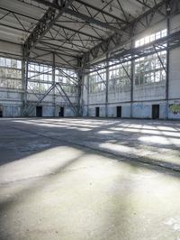 This is an image of an industrial airplane hangar in Berlin, Germany. The building's architecture is characterized by a concrete surface and graffiti-covered walls. The open space inside the hangar is filled with shadows and hard lighting, creating an abstract and rugged atmosphere. The hall of the hangar is spacious and has a factory-like feel. This photo represents the industrial and urban landscape of Berlin. It showcases the unique combination of architecture, graffiti, and open space that can be found in this city.