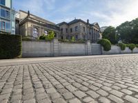 Modern architecture in Berlin, Germany. A stone wall with many windows creates an impressive facade. Open green space with bushes on either side. A bustling business district in the heart of Europe.