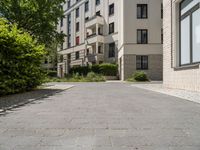 This stock photo showcases a modern residential building in Berlin, Germany. The image captures a brick road surrounded by two buildings with bushes in the front. Above, a beautiful blue sky with some clouds adds to the picturesque scene. The photo represents the city life and urban design of Berlin, highlighting its modern architecture and infrastructure. The residential area is presented with well-maintained landscaping, including grass and vegetation. The straight road leads the viewer's gaze straight down the road, offering a clear perspective of the environment. The buildings feature windows and residential fixtures, symbolizing a comfortable home and a thriving neighborhood. The image represents the appeal and charm of urban living in Europe's capital city, Berlin.