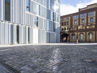 Low angle view of a modern office building in Berlin, Germany. The sleek facade and metal walls add to the city's urban design. The open plaza and cobblestone road surface are reminiscent of the city's rich history and architecture.