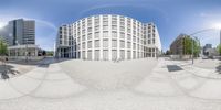 A snapshot of Berlin's vibrant cityscape. Modern architecture dominates the mixed-use neighborhood. Straight roads and concrete facades create a monochromatic pattern. The distorted building in the background adds a touch of artistic flair.