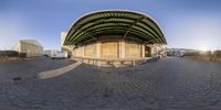 a fisheye lens picture of an outside of a building and bus station with the roof up