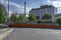 This stock photo showcases the modern architecture and urban design of Berlin, Germany. The photo captures a city street lined with modern buildings and infrastructure, including roads, windows, and parking garages. The asphalt road surface contrasts with the lush vegetation and trees that adorn the sidewalks. The image symbolizes the urban development and property values in this vibrant European city.