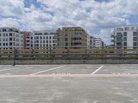 This stock photo showcases the modern architectural design of a high-rise condominium building in Berlin, Germany. The city's urban design can be seen in the wide asphalt road and the parking deck below. The clear sky and fluffy clouds create a picturesque backdrop to the classic and contemporary architecture. The concrete street and land lot provide a stark contrast to the buildings, creating an urban landscape that is both bustling and serene. This image captures the essence of Berlin's vibrant cityscape.
