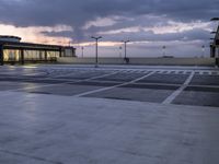 This stock photo features the modern architecture of Berlin, Germany at dawn. The city skyline is beautifully illuminated with artificial lights, creating a stunning reflection on the road surface. The open space and parking lot provide ample space for vehicles. The atmosphere is calm and serene, with clouds drifting across the sky. The image captures the essence of Berlin's contemporary cityscape and its vibrant energy. A perfect depiction of Europe at the break of day.