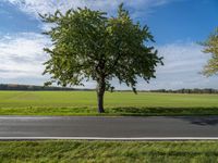 This image captures a rural landscape in Berlin, Germany. The clear sky creates a picturesque backdrop for the two trees standing along the empty road. In the distance, a lush grassy field stretches out, bathed in sunlight. The autumn colors of the trees and the greenery of the field add vibrancy to the scene. This photo represents the natural beauty of the European countryside with its open fields and peaceful surroundings.