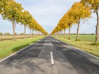 This image showcases the scenic beauty of a road in Berlin, Germany. The road stretches straight ahead, flanked by rows of lush green trees on both sides. The vibrant autumn foliage adds a splash of color to the landscape. The cloudy and gloomy grey sky creates a moody atmosphere. The surrounding grassy areas and fields further enhance the natural beauty of the scene. This photo captures the peacefulness of the European countryside and the harmony between man-made infrastructure and nature.