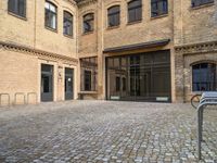 This image showcases the classic architecture of Berlin, Europe. The brick sidewalk is surrounded by beautiful buildings with windows and wooden facades. The open space features a bike rack with several bicycles parked nearby. The brick surface adds to the charm of the courtyard, giving it a rustic feel. This photo captures the essence of a sunny day in Berlin, highlighting the city's unique Hinterhof and warehouse architecture. The combination of brickwork, cobblestone, and classic architecture makes this scene a visual delight.