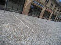 the sidewalk is paved with stones and has a bench in front of it, with no people inside