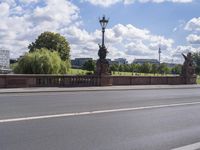 This stock photo features a bridge in Berlin, Germany, crossing over a busy highway. The bridge is adorned with an ornamental fence, featuring statues. The modern architecture of the city can be seen in the buildings in the background. The image captures a sunny day with clear skies, showcasing the city's urban design. The road surface, made of asphalt, is lined with trees and vegetation. The street is well-lit with street lights, creating a picturesque scene. This photo perfectly represents the classic and modern architecture of Berlin, a city renowned for its urban beauty in Europe.