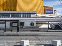 This photo captures the modern architecture of Berlin, Germany. The image depicts an empty sidewalk leading to the airport terminal, with benches and stairs along the walkway. The clear sky and composite material facade of the terminal create a sleek and urban design. This scene represents the city life and metropolitan area of Berlin. The location is a bustling transport hub in Europe. With its modern infrastructure, office buildings, and road surfaces, Berlin is a vibrant city with a rich urban atmosphere.