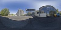 An empty parking lot surrounded by buildings in Berlin. The clear sky reflects off the glass walls and steel structures, showcasing the city's modern architecture. A classic example of urban design in Europe.