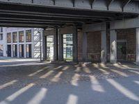 This is an image of a cityscape in Berlin, Germany. The architecture showcases a mix of modern buildings, concrete bridges, and cobblestone streets. The open spaces and walkways create a vibrant urban design. The photo captures the city life and bustling activity of this metropolitan area. The clear blue sky above reflects off the windows and surfaces, creating interesting reflections. The image also highlights the material properties of the buildings, including their lines, columns, and beams. This photo represents the dynamic and art district of Berlin, a city known for its innovative urban infrastructure.