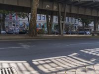 A view of Berlin's urban landscape. The shadow of a train bridge casts itself over a busy street lined with buildings and trees. The city's infrastructure and road surfaces are well-maintained, creating a seamless flow of traffic in this bustling European metropolis.