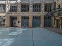 A view straight down the road in Berlin's urban business district. Classic architecture and brick walls surround office buildings and warehouses. Open courtyards and glass surfaces contrast with the concrete and asphalt surfaces of the city. A bustling city life in Europe's dynamic capital.