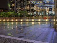 A wet night in Berlin's business district reveals the city's modern architecture. Neon lights illuminate the dark streets and reflections shimmer on the wet surface. The urban design and open spaces create a vibrant atmosphere.