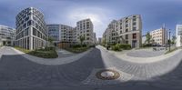 A straight road in Berlin's business district showcases modern architecture and urban design. Cobblestone streets and pavers complement the city's historical charm. Shadows cast by office buildings create a striking contrast on a clear day.