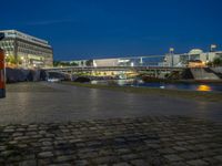 Dawn breaks over Berlin's urban landscape with a river reflecting modern architecture. Clear sky complements city life as office buildings stand tall among cobblestone streets, synonymous with Germany's cityscape.