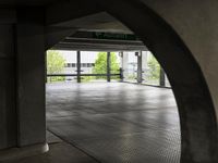 This image captures the modern architecture and urban design of Berlin, Germany. The concrete street is lined with parking decks and garages, creating an open space in the city. The dark, empty road surface contrasts with the vegetation and trees in the background. The gray tiles and signs littering the ground add to the urban atmosphere. The composition of the image showcases symmetry, with rectangles and arches throughout. This photo represents the city life and architectural beauty that can be found in Berlin, a vibrant city in Europe.