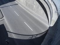 This image captures the modern architecture and urban design of Berlin, Germany. The photo shows an elevated freeway going under an overpass, with an empty road stretching ahead. In the foreground, a man rides his bike, adding a sense of city life and activity. The concrete walls and asphalt road emphasize the urban environment. The high bridge and tunnel showcase the architectural elements of the city. This photo represents the modern and vibrant city of Berlin in Europe.