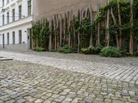 This image captures the essence of urban living in Berlin, Germany. The classic architecture of the residential buildings is adorned with cobblestone roads and green courtyards. The facades display large windows and intricate details. The urban design features a mix of public spaces and suburban areas, creating a dynamic city life. The ground is covered with grass and various types of vegetation, including a vertical garden and a green wall. This photo showcases the beauty of Berlin's architecture and the harmonious blend of nature and city elements.
