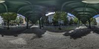 Berlin's urban landscape featuring wet asphalt and classic architecture. City life thrives under hard shadows, with bridges and underpasses adding depth. A snapshot of European urban design.