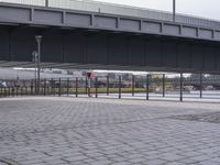 a man is skateboarding on a brick walkway by water near buildings and bridge overpass