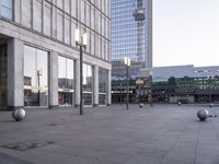 A modern architecture building in Berlin's city center, with large shiny silver balls in front. The building's facade stands out amidst the downtown skyscrapers. This tourist attraction is located in Alexanderplatz, the heart of Berlin's thriving business district.