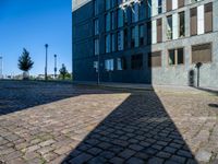 Berlin City: An Empty Cobblestone Street with Modern Office Buildings and Shadows