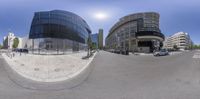 A 360-view of a bustling city intersection in Berlin. The modern architecture of the office building stands out against the grey cityscape. The clear sky reflects off the glass windows, creating a futuristic atmosphere.