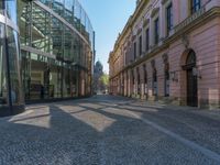 Urban design in Berlin, showcasing modern architecture and city life. Glass walls reflect the clear sky, casting hard shadows on cobblestone alleys. A mix of old and new surfaces creates open spaces in Europe.
